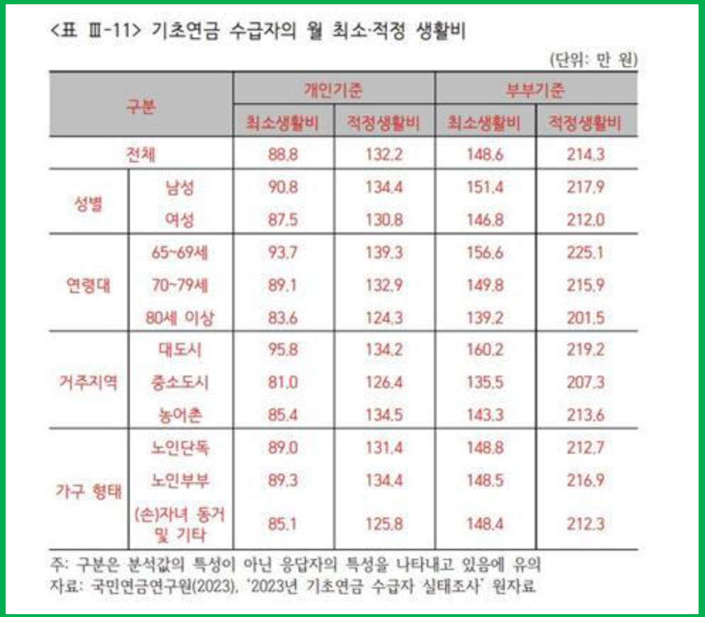 조사 결과에 따르면, 기초연금 수급자는 기본적인 생활을 하려면 월 최소 생활비로 개인 기준으로 88만8천원, 부부 기준으로는 148만6천원이 필요하다고 생각했다. 최소 생활비는 특별한 질병 등이 없는 상태에서 최저의 생활을 유지하는 데 필요한 비용을 말한다.